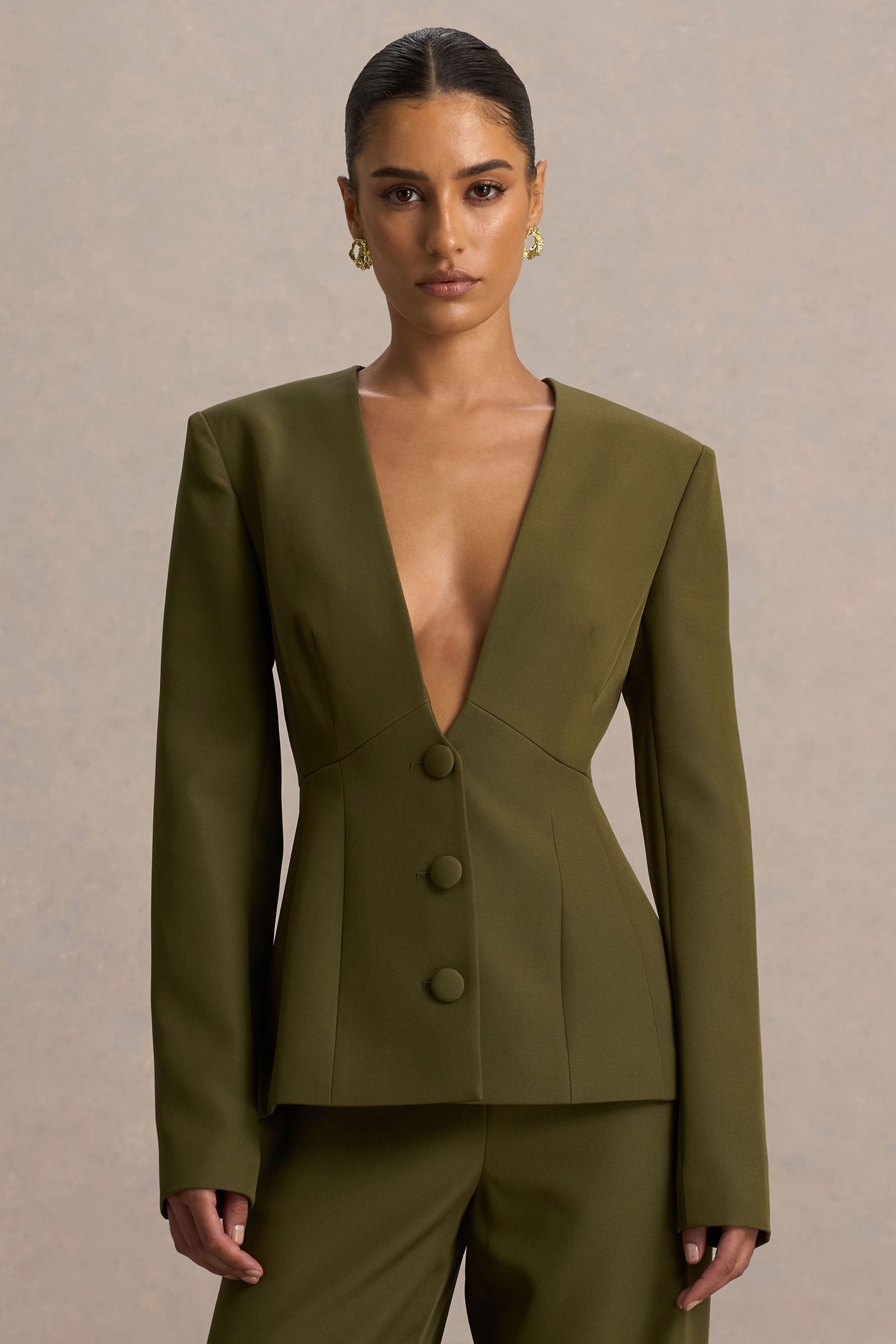 Rosalina | Olive Extreme-Plunge Neck Tailored Blazer