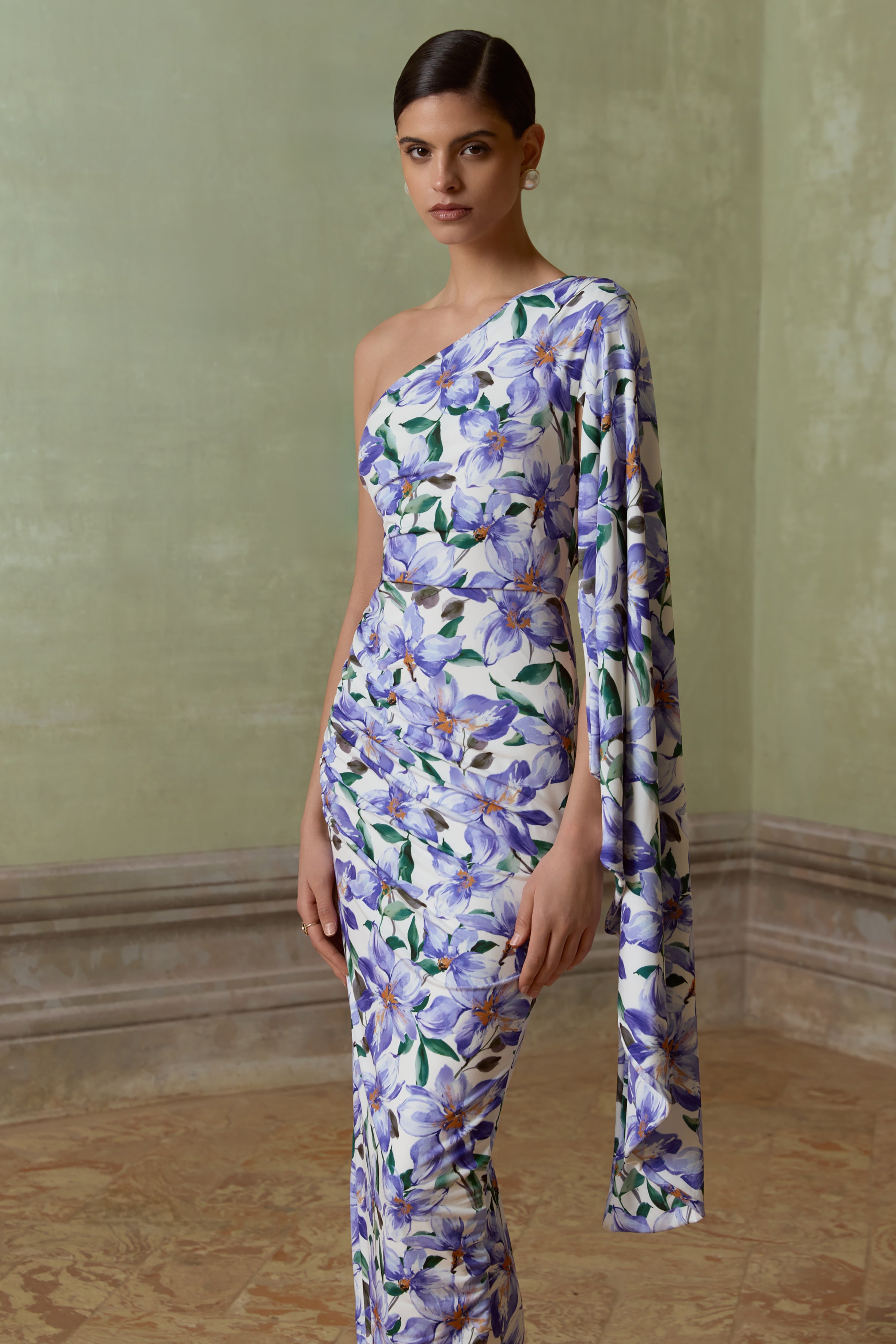 Clementina | Purple Lily Print Asymmetric Cape Sleeve Maxi Dress