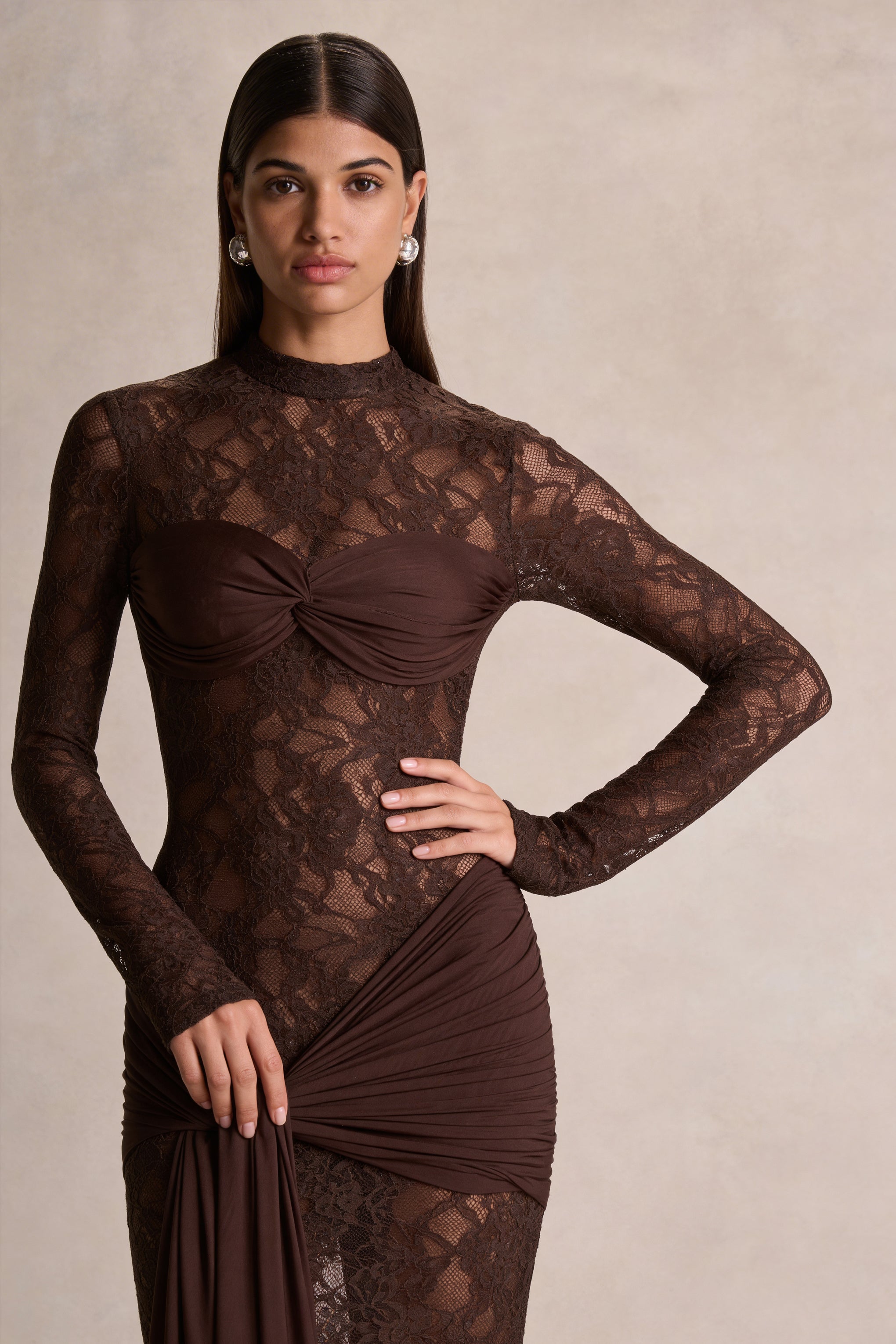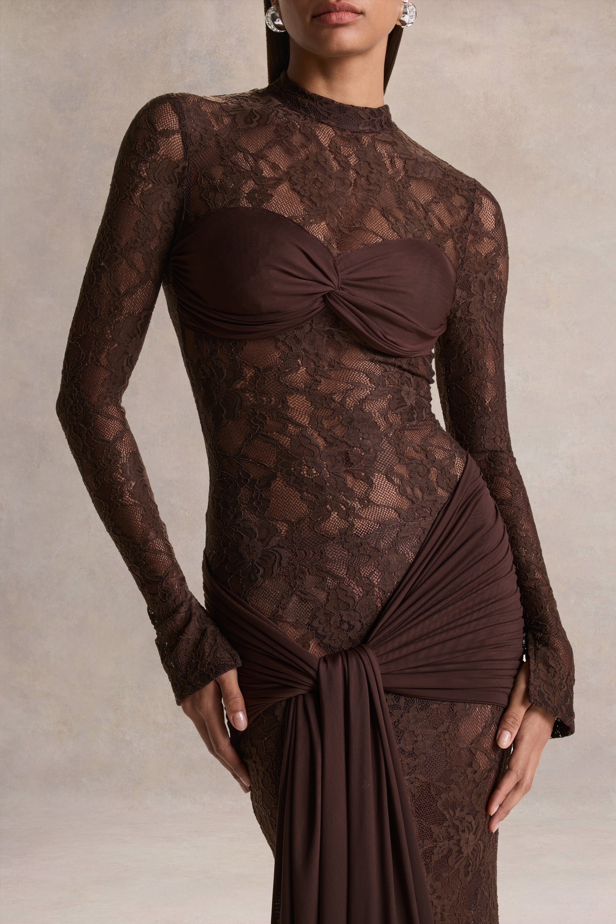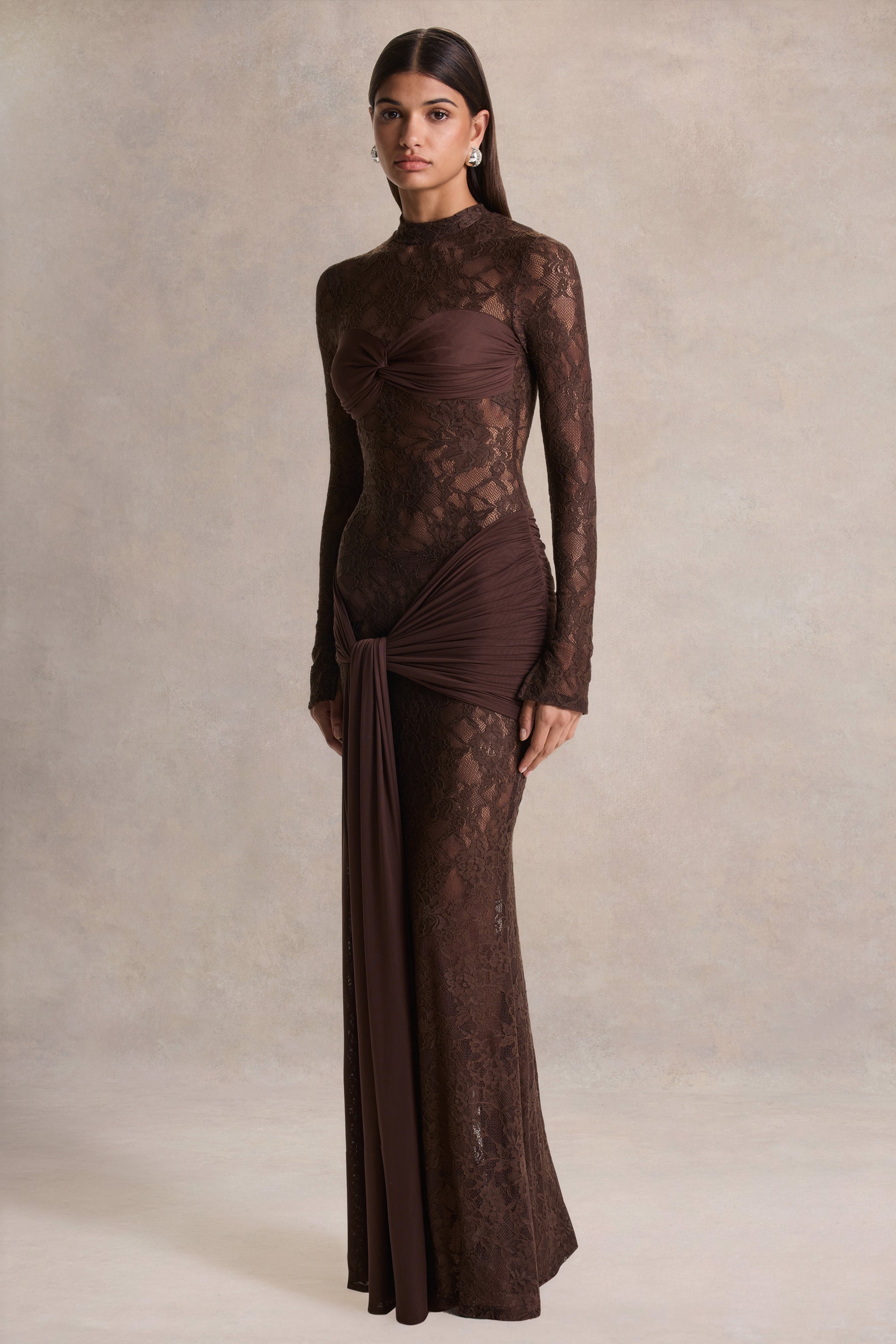 Akira delivers bold elegance with a sultry. sculpted finish. Crafted from our premium brown lace. this maxi dress showcases intricate modernity balanced by refined structure. The high neckline adds a touch of classic sophistication. while the draped sash detail introduces fluid movement and dramatic definition at the waist. Alluring and utterly captivating. Akira is made for moments that demand glamour.