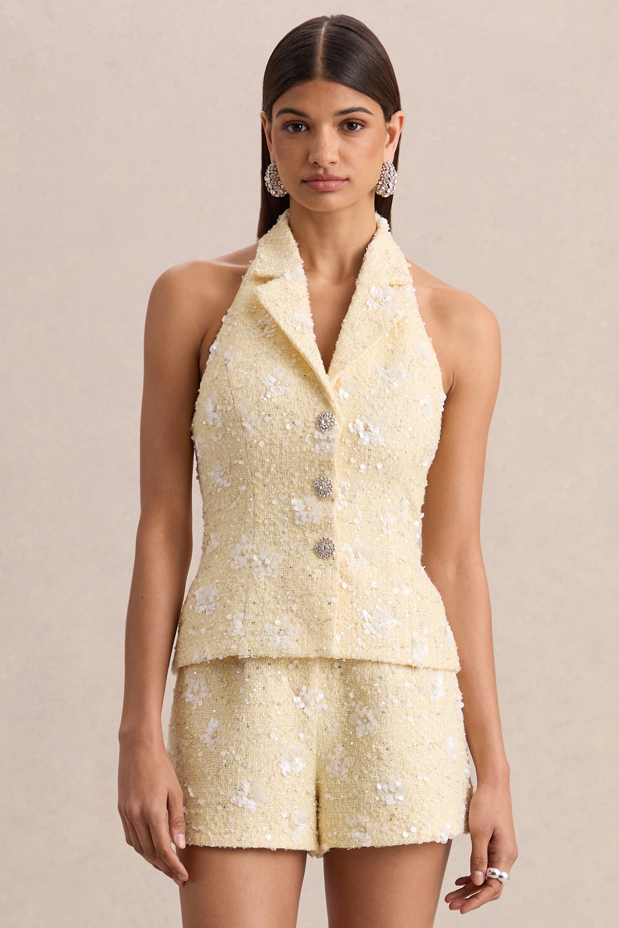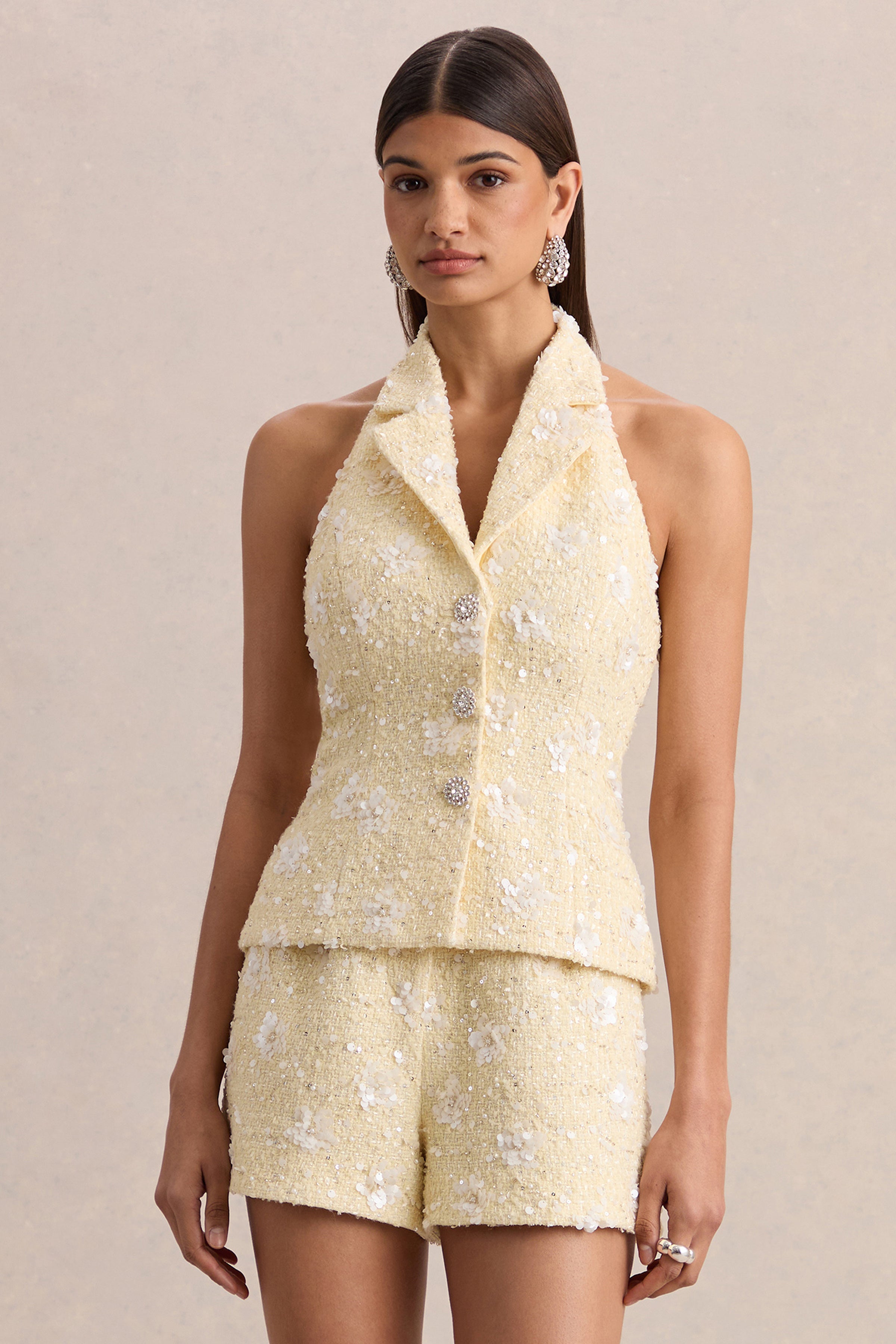 Add this season must have. Alba to your wardrobe. Crafted from our premium embellished boucle in beautiful lemon hue. this cropped top is the perfect addition to your collection. Featuring Plunge collared neckline for bold elegance and self covered buttons for a classy. seamless design. Pair with Blaise for perfectly coordinated look.
