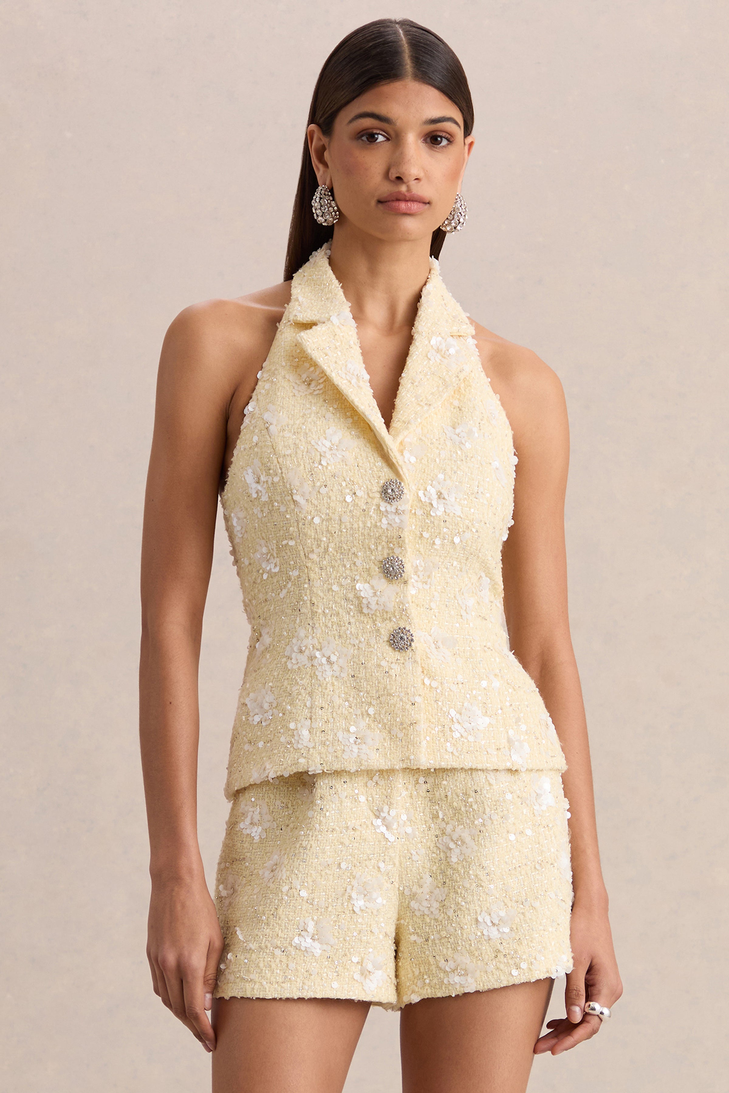 Premium embellished boucle in lemon (85% Polyester. 8% Elastane. 7% other fibres)