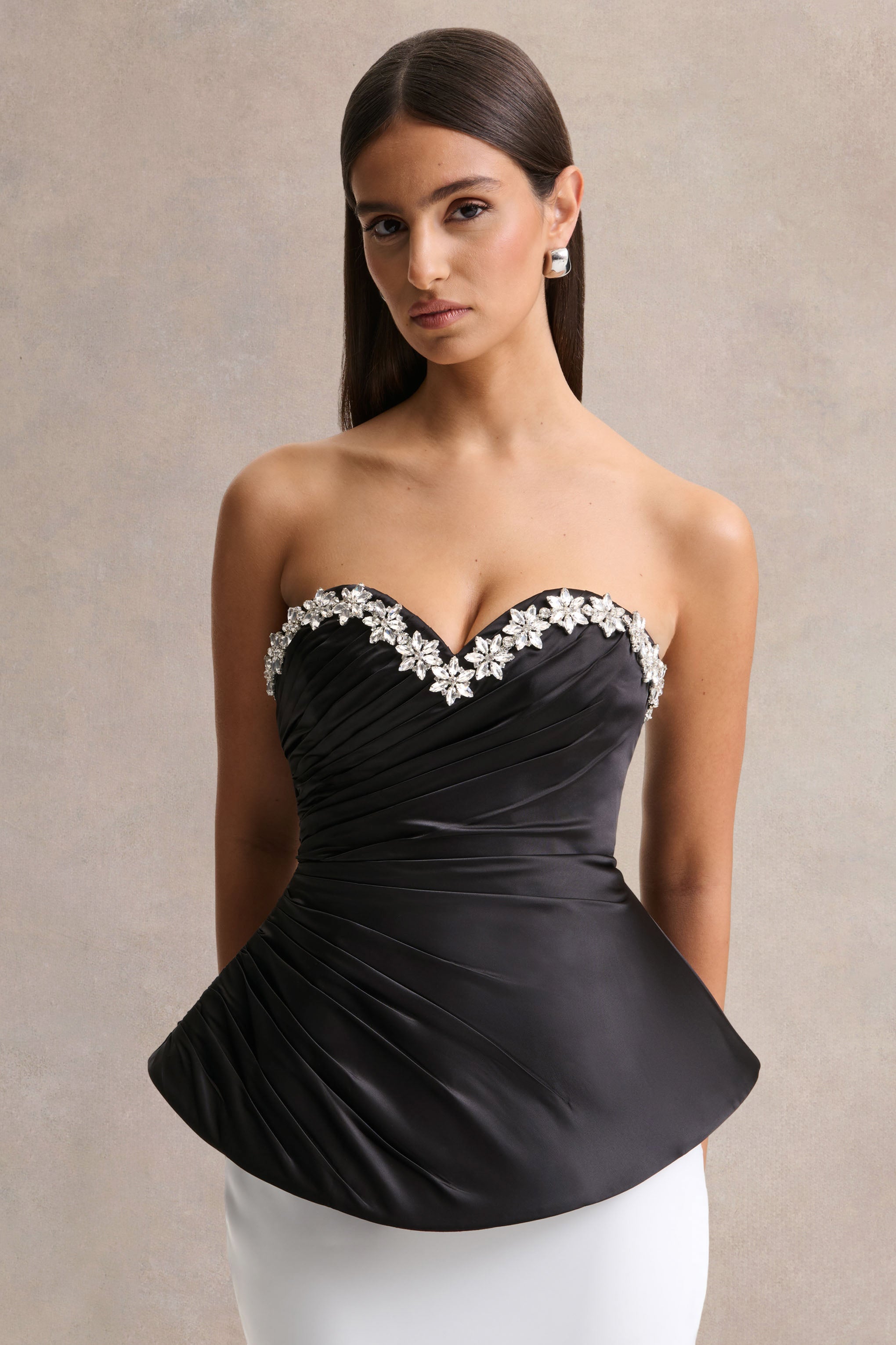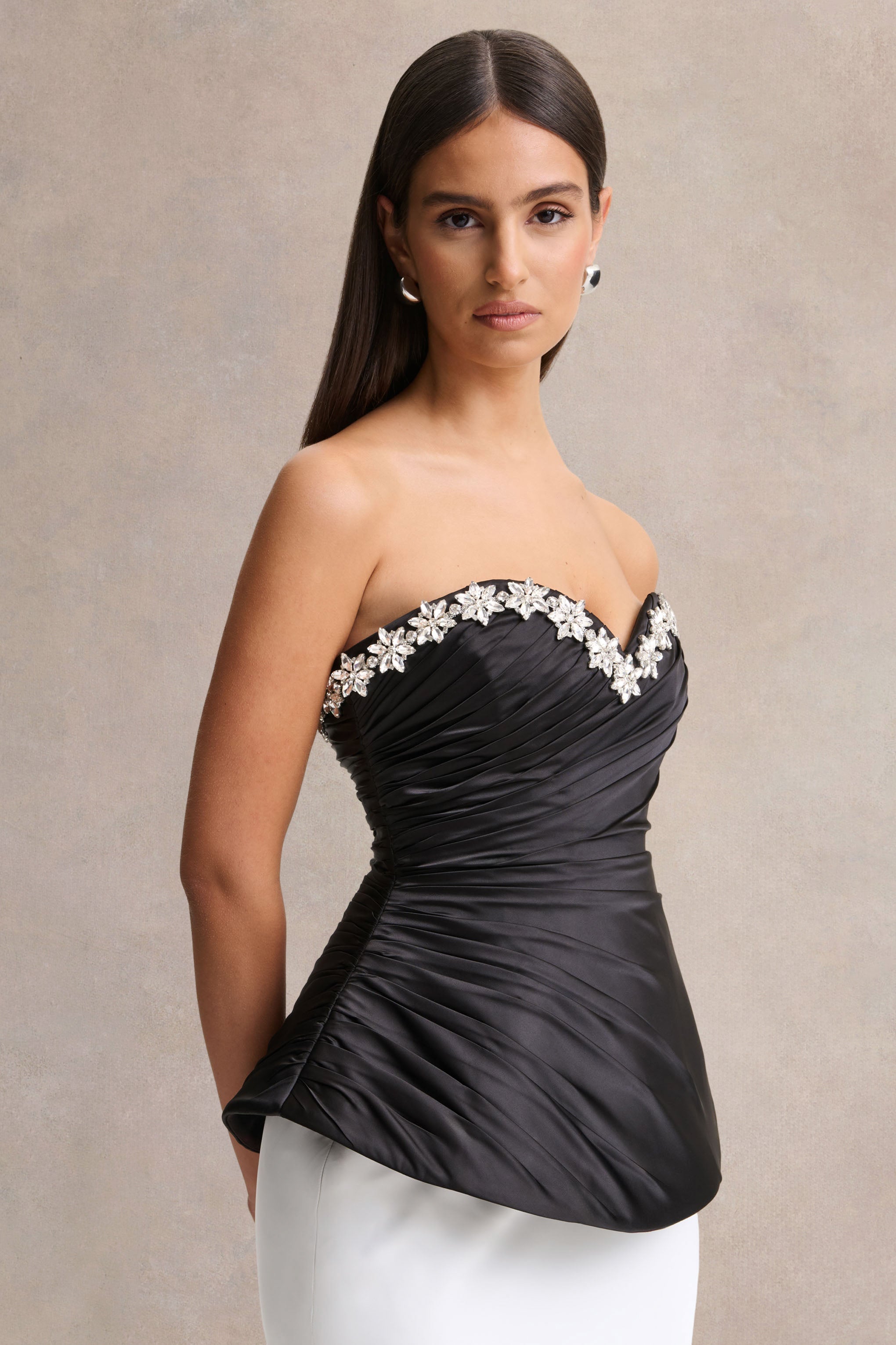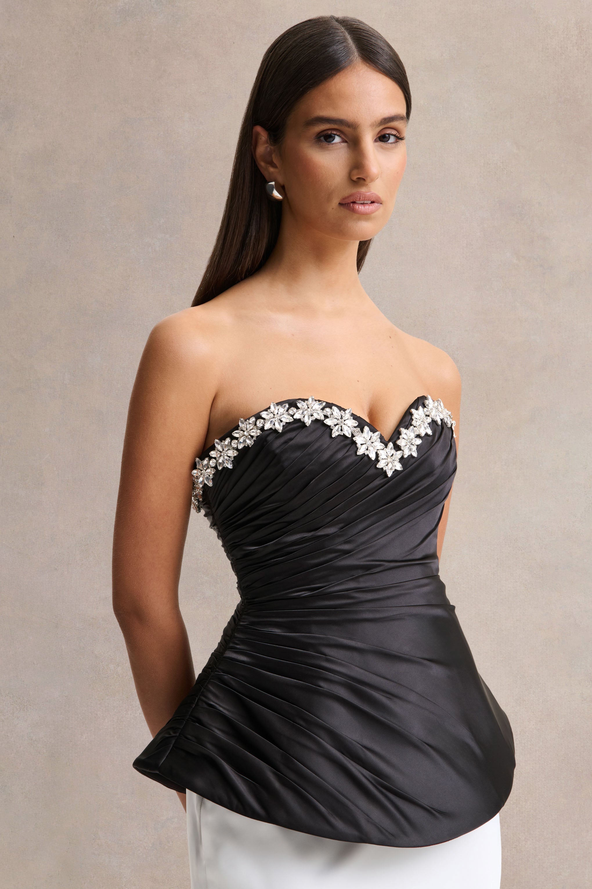 Say hello to Ambria. a true statement of sophistication and allure. Crafted from our premium black satin. this corset top cinches you in for a flawless fit. Featuring a hand-embellished sweetheart neckline that beautifully frames the décolletage. The gathered detailing enhances the silhouette. creating a sculpted. feminine shape that exudes confidence. Luxurious and elegant. Ambria is the perfect choice for evening occasions that call for timeless glamour.