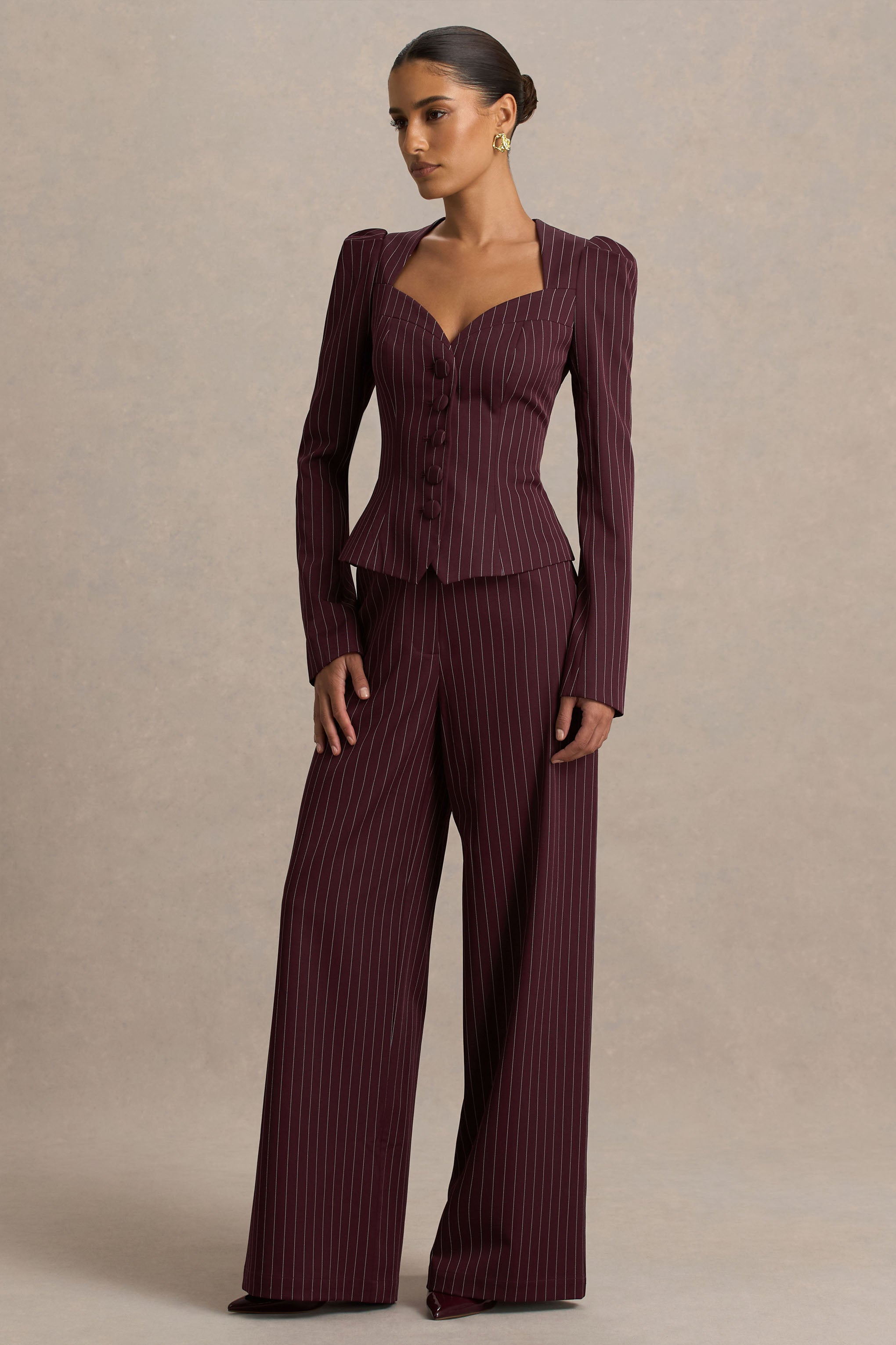 Sharp. tailored. and undeniably chic. Asteria is a power piece designed to redefine occasion dressing. Cut from our premium burgundy pinstripe woven fabric. these trousers contour the figure with a flattering fit before falling into a sleek wide leg. Belt loops and front pockets add tailored detailing. making them as functional as they are stylish. Style with our Lana top for a polished co-ord look that takes you from business meeting chic to date night glam.