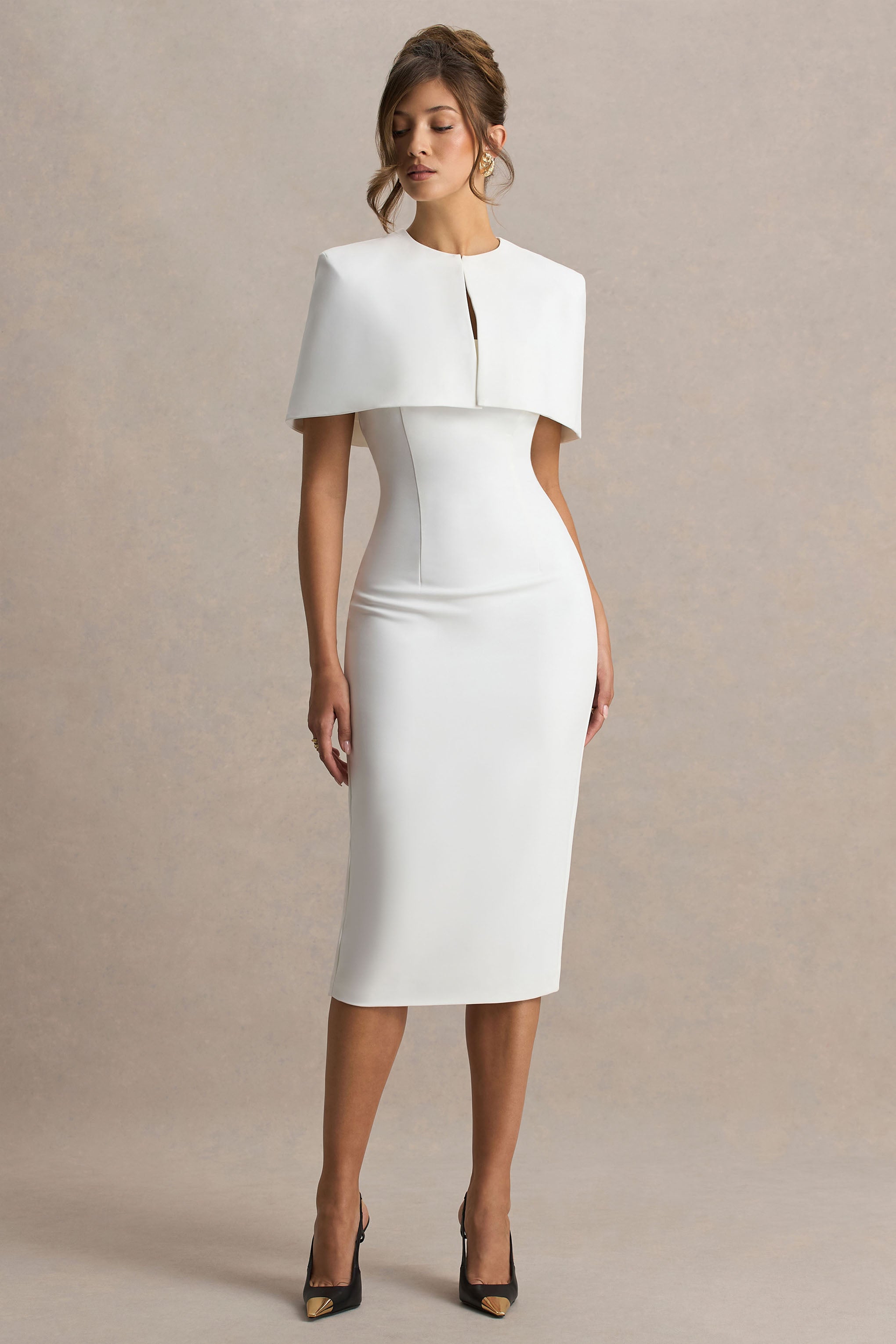 Introducing Baylor. a vision of timeless elegance with a modern edge. Cut from our premium crepe in a clean white hue. this sophisticated midi silhouette is designed to captivate. Featuring a refined round neckline and a chic removable-short cape overlay. the dress is elevated with discreet adjustable cami straps beneath for a flawless fit. Complete with a centre-back split to ensure ease of movement. Baylor is the perfect balance of drama and grace.