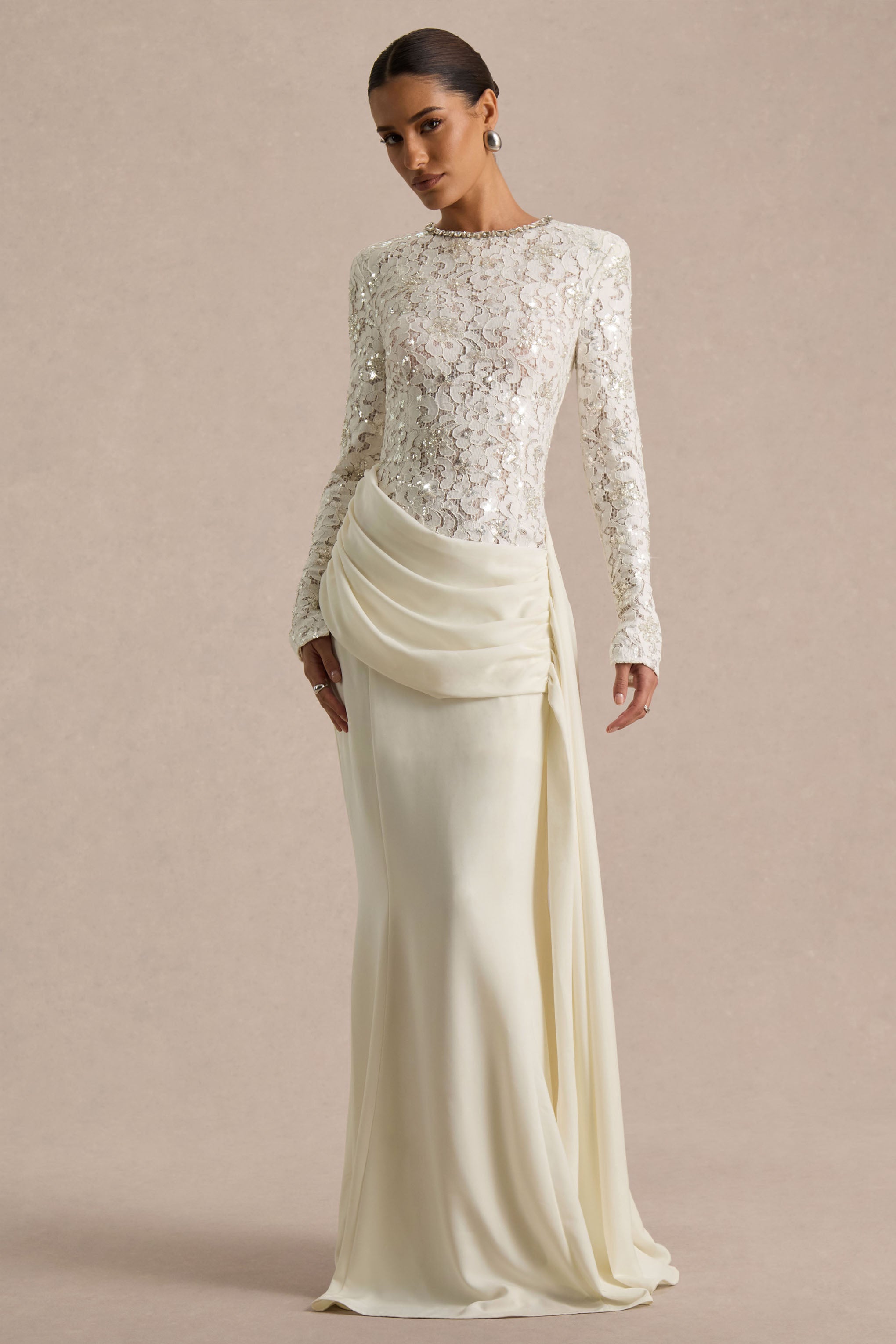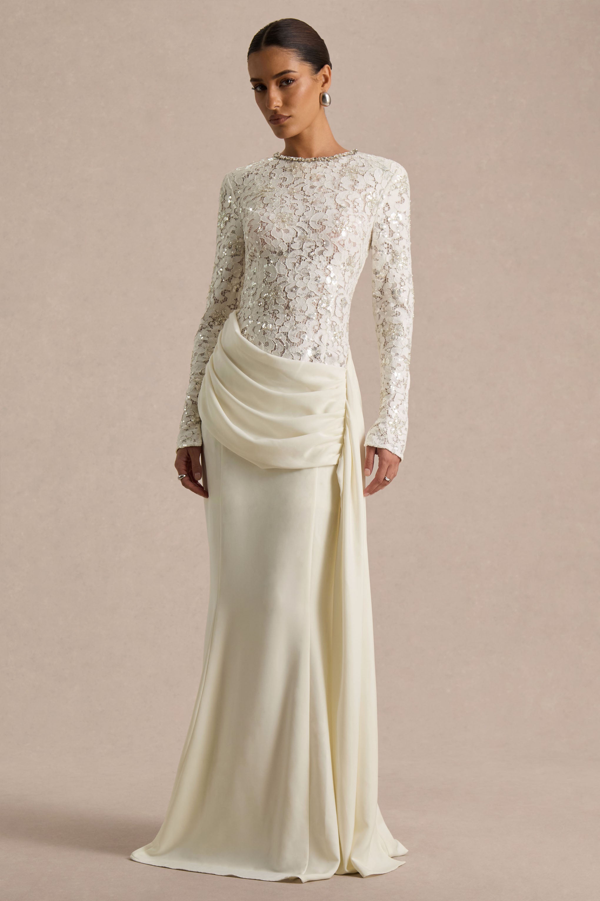 Beau is the embodiment of timeless romance. Crafted from our delicate premium lace in a soft ecru hue. this maxi-length design exudes effortless elegance. The embellished crew neckline adds a touch of refined sparkle. while the draped skirt and flowing sash detail create graceful movement with every step. Beau is a picture of sophistication. perfect for occasions that call for subtle glamour and classic femininity.