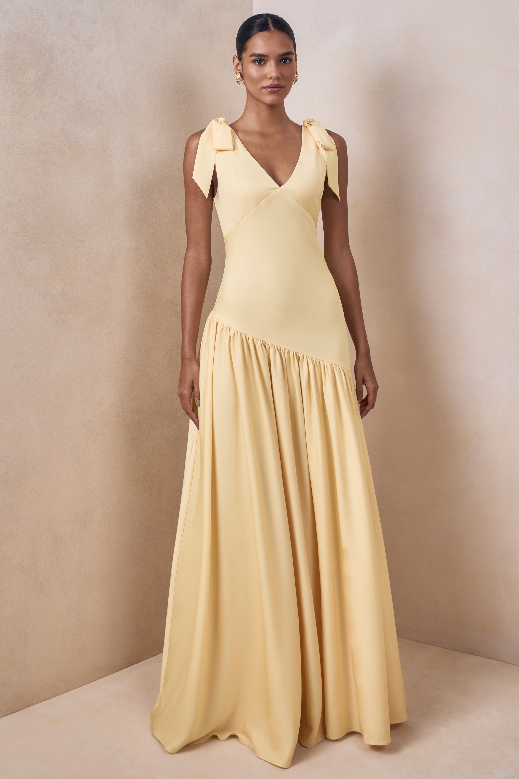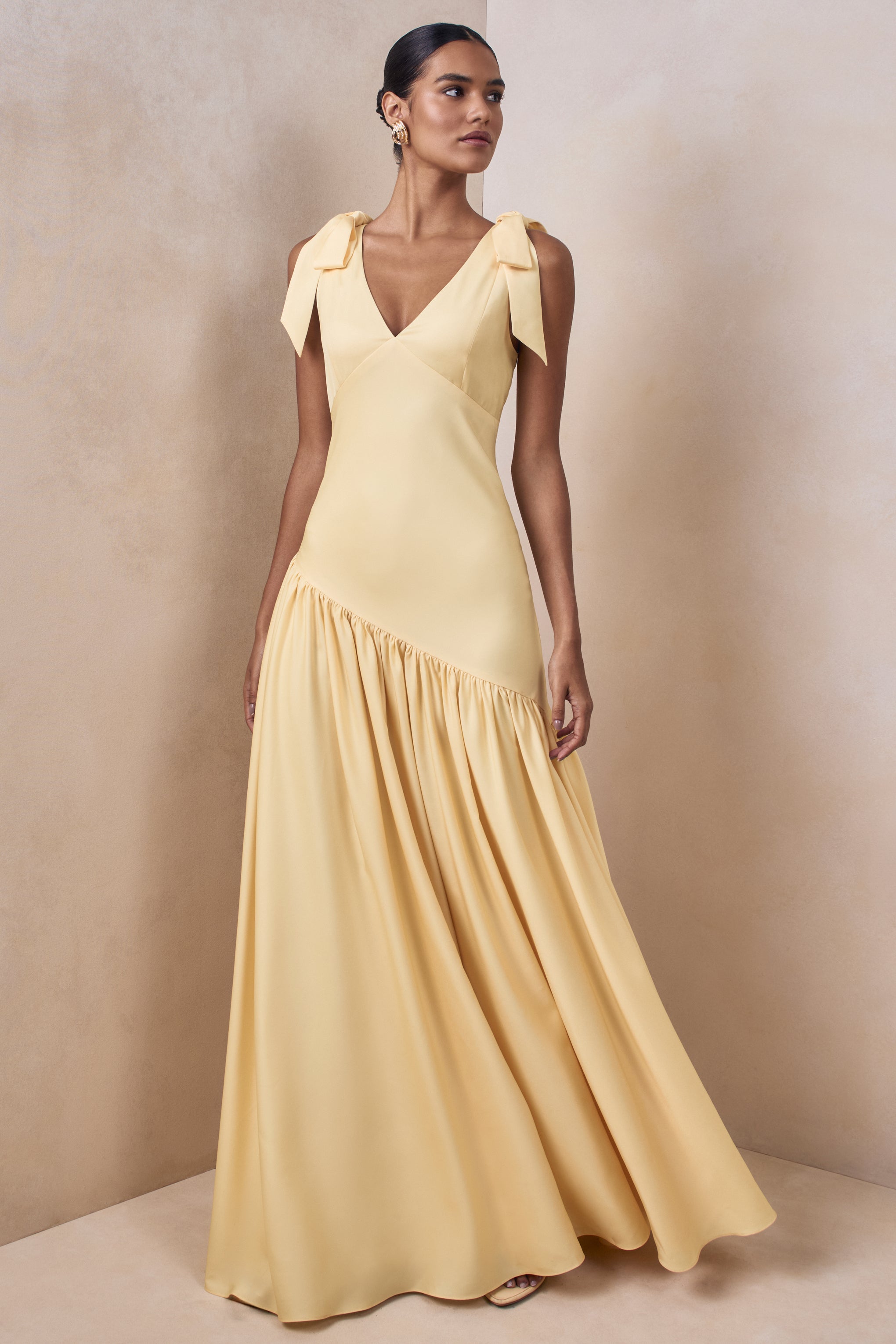 Cala brings romantic drama to a modern silhouette with an unmistakably elegant finish. Crafted from our premium lemon satin. this maxi-length design flows beautifully with a soft. luminous sheen. The plunge neckline creates a striking focal point. complemented by statement bow sleeves that add feminine charm. An asymmetric drop-waist sculpts the figure with contemporary edge. making Cala the perfect choice for moments that call for graceful impact.