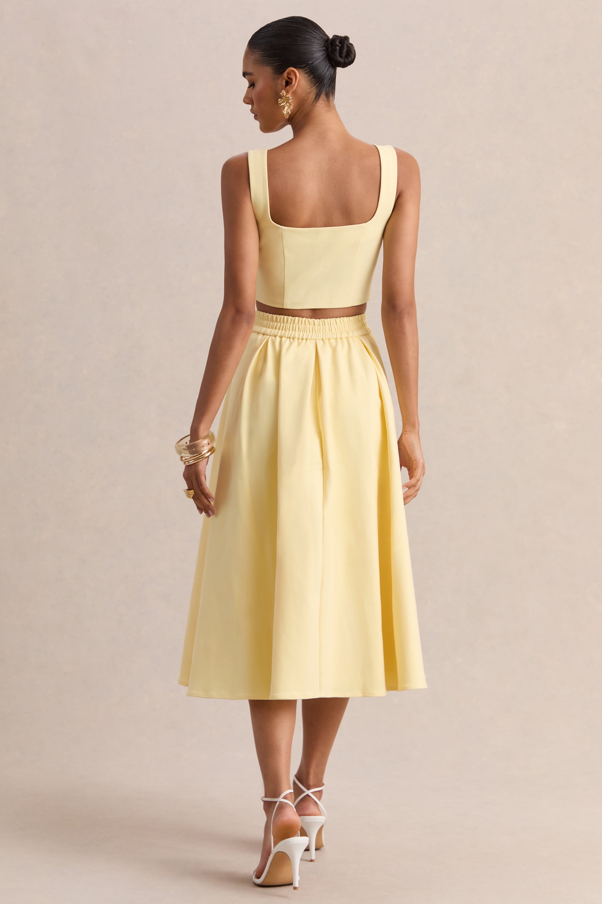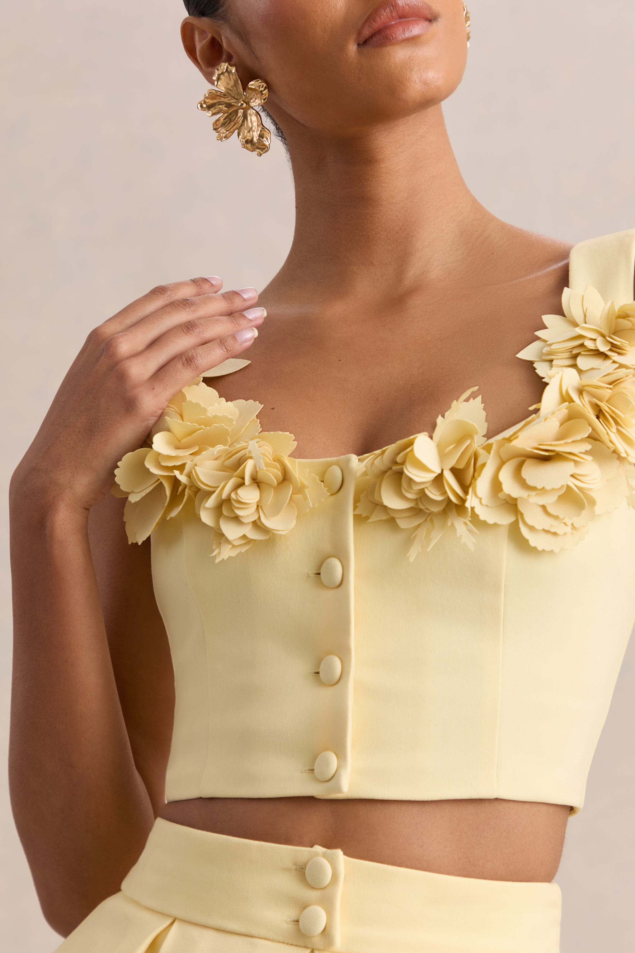 Designed to make a romantic statement. Caprielle has arrived. Crafted from our premium cotton modal in a delicate lemon hue. in this crop top you will be exude elegance into any room. The scoop neckline is complimented by delicate floral embellishment. that also covers through the straps. giving this piece a chic and feminine edge. The self-covered buttons add a tailored finish to Caprielle. ensuring you're flattered from all angles. From ladies brunches to evening cocktails. Caprielle will be your go-to all season long.