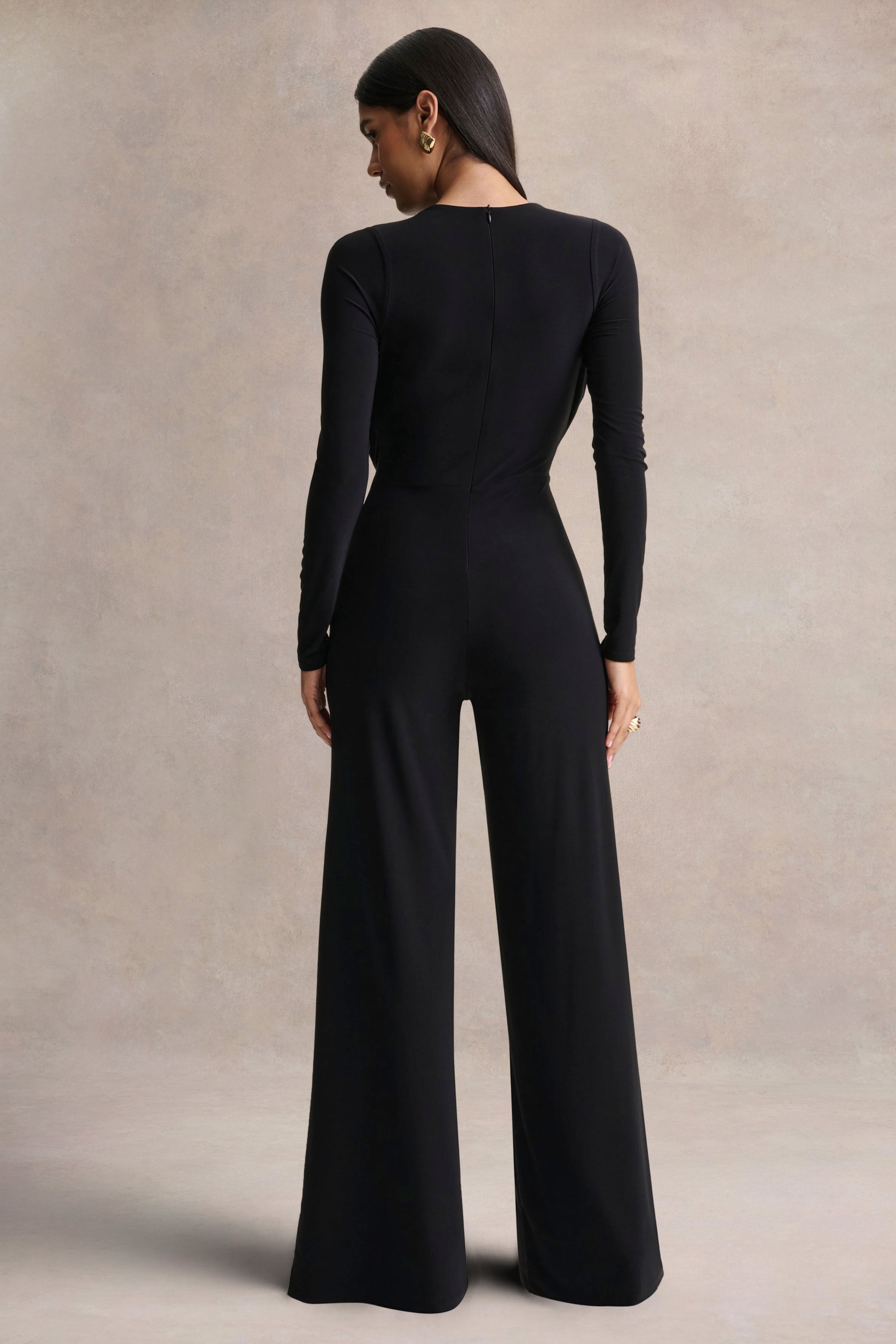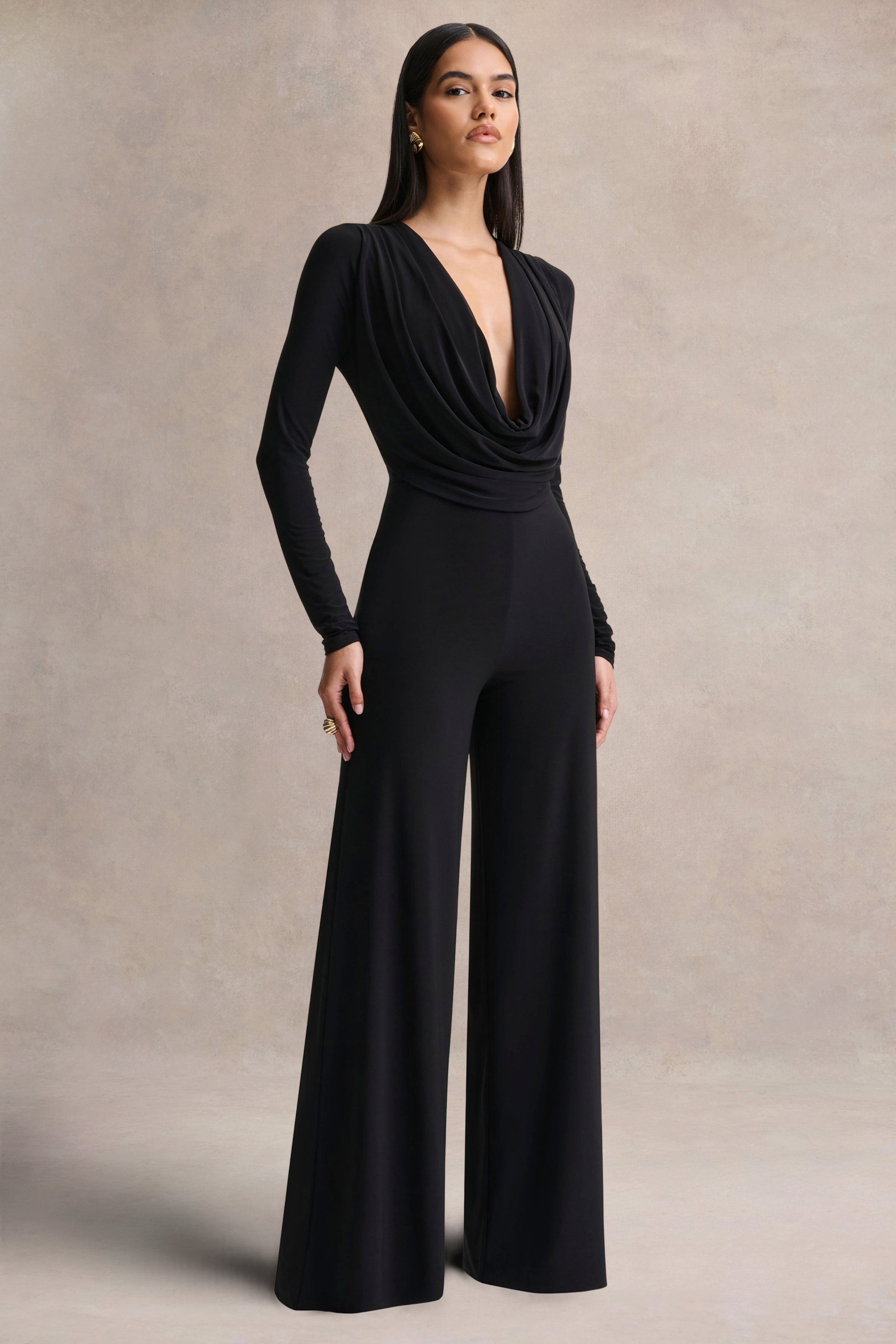 Catriona blends sleek sophistication with a confident. contemporary edge. Crafted from our premium black stretch jersey. this jumpsuit hugs the silhouette with smooth. sculpted ease. The plunge neckline creates a bold. alluring focal point. while long sleeves balance the look with refined elegance. Streamlined and effortlessly empowering. Catriona is designed for moments that call for modern glamour and poise.