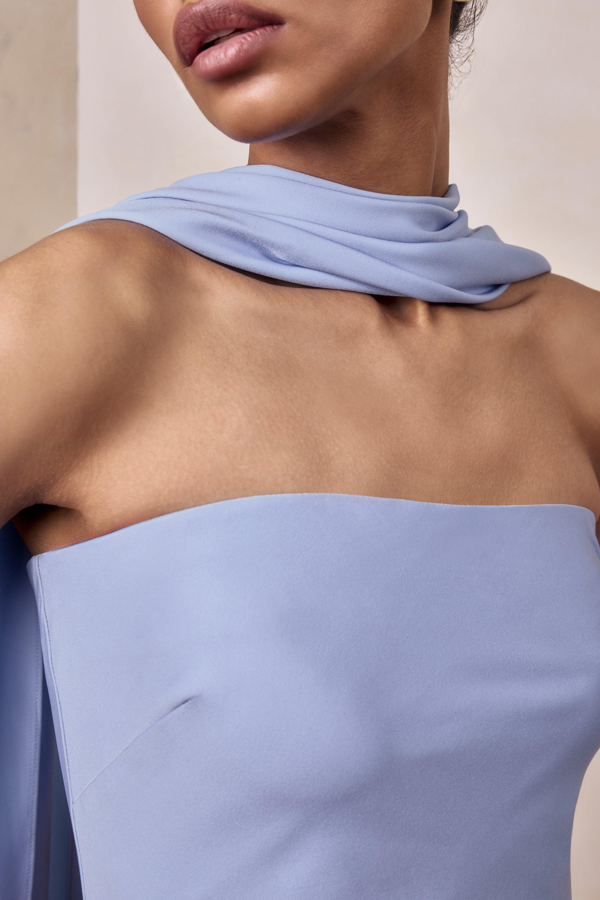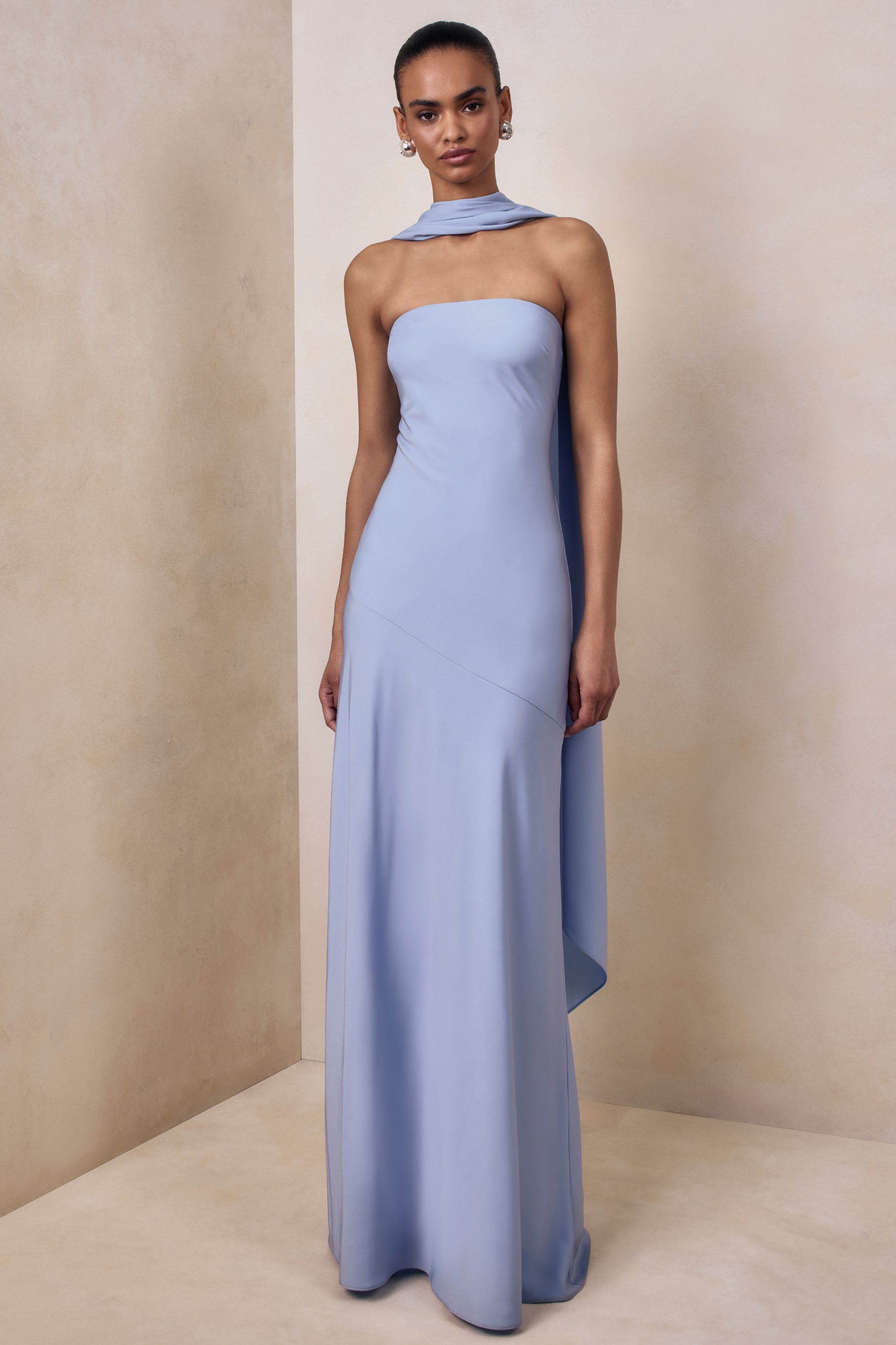 Charly exudes effortless glamour with a sleek. fluid silhouette designed to captivate. Crafted from our premium powder blue satin. this maxi dress drapes beautifully with a soft. luminous sheen. The bandeau neckline creates a clean. modern frame. while the flowing scarf detail adds a touch of drama and movement. Elegant and endlessly refined. Charly is made for moments that call for understated luxury.
