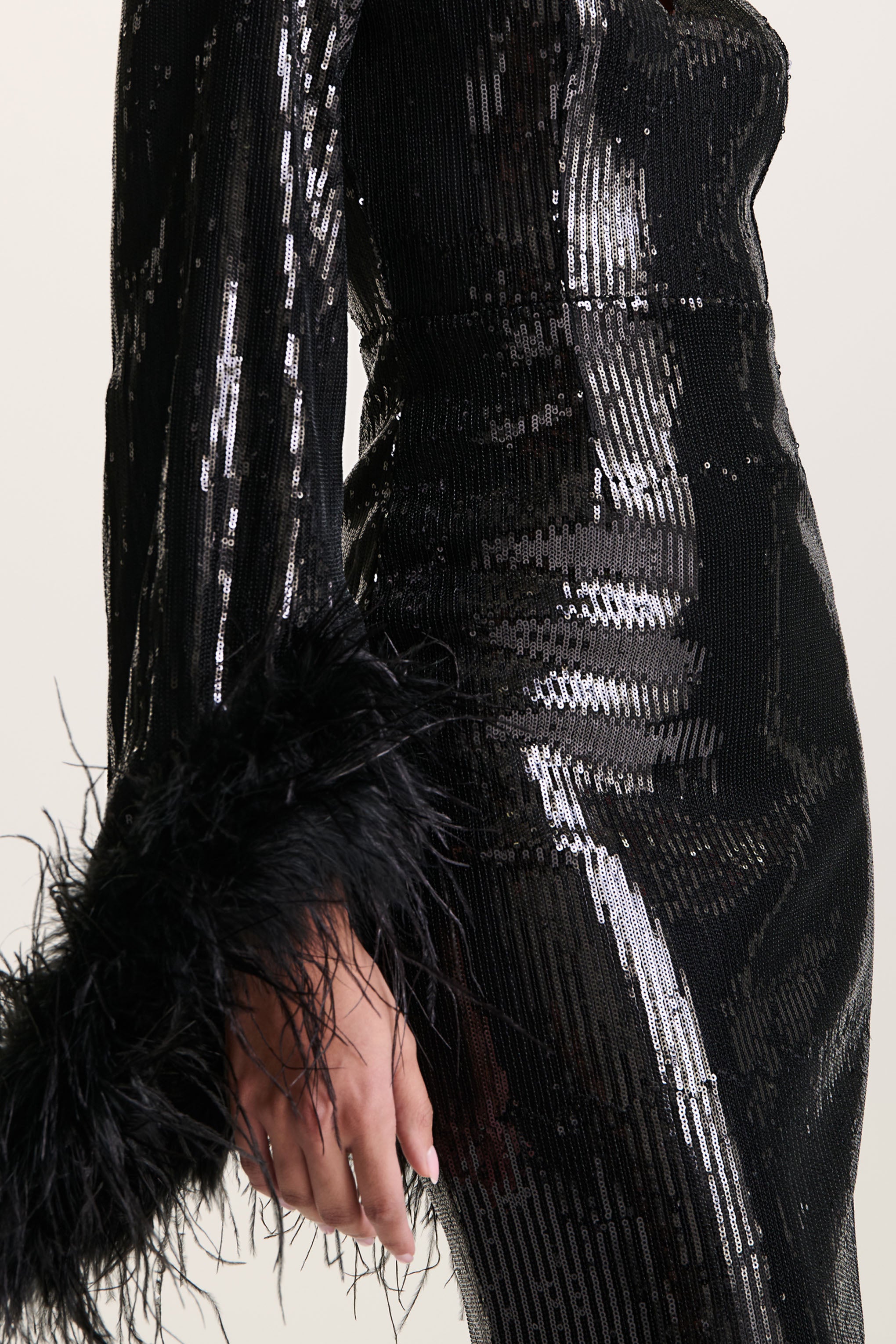 Scattered with light-catching sequins. Cosmic Star was designed to stand out. Designed for special occasions. this black maxi dress boasts a high neckline. keyhole cut-out and luxurious feather trimmed sleeves. Complete with a floor-sweeping train - whats not to adore with Cosmic Star?