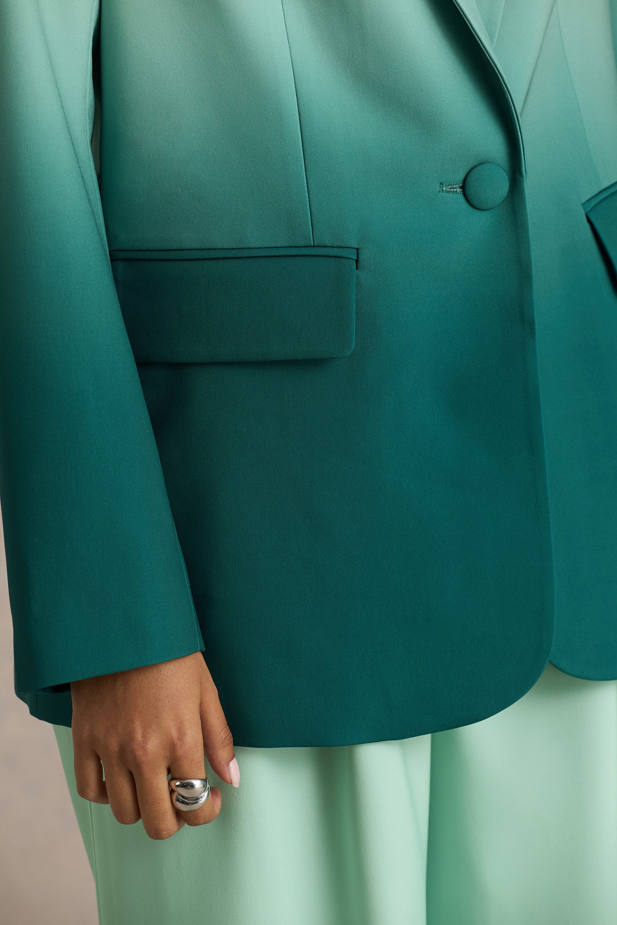 Introducing our latest statement-making piece Enya. This elevated blazer is cut from our premium satin in a striking emerald ombré. Featuring a sharp collared neckline and single button fastening. this tailored piece balances sleek structure with standout style. Pairing perfectly with our Safia trousers. this suit was made to make power moves.
