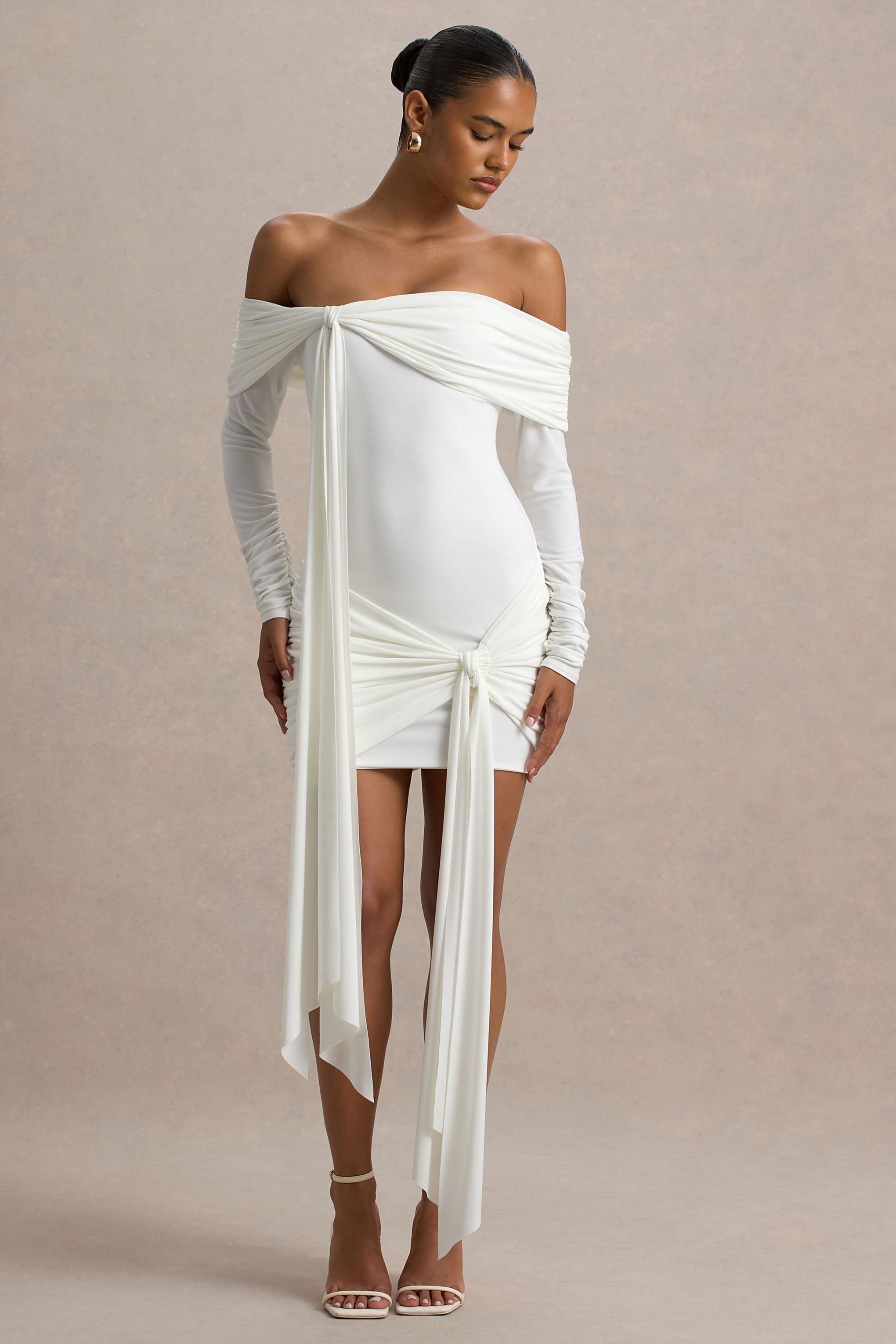 A bold silhouette made for unforgettable entrances. Essie brings statement glamour with every step. Cut from our premium stretch jersey in a clean white hue. this mini dress contours the body with a figure-enhancing fit. The off-shoulder bardot neckline frames the decolletage. while an exaggerated sash detail adds sculptural drama. Finished with flattering ruched detailing at the waist. and another statement sash. Essie embodies ethereal charm. Perfect for VIP moments. paired with heels and minimal accessories to let the silhouette speak for itself.