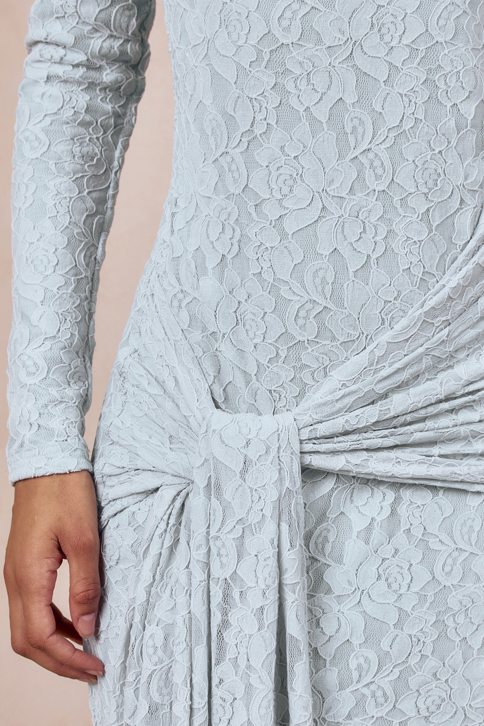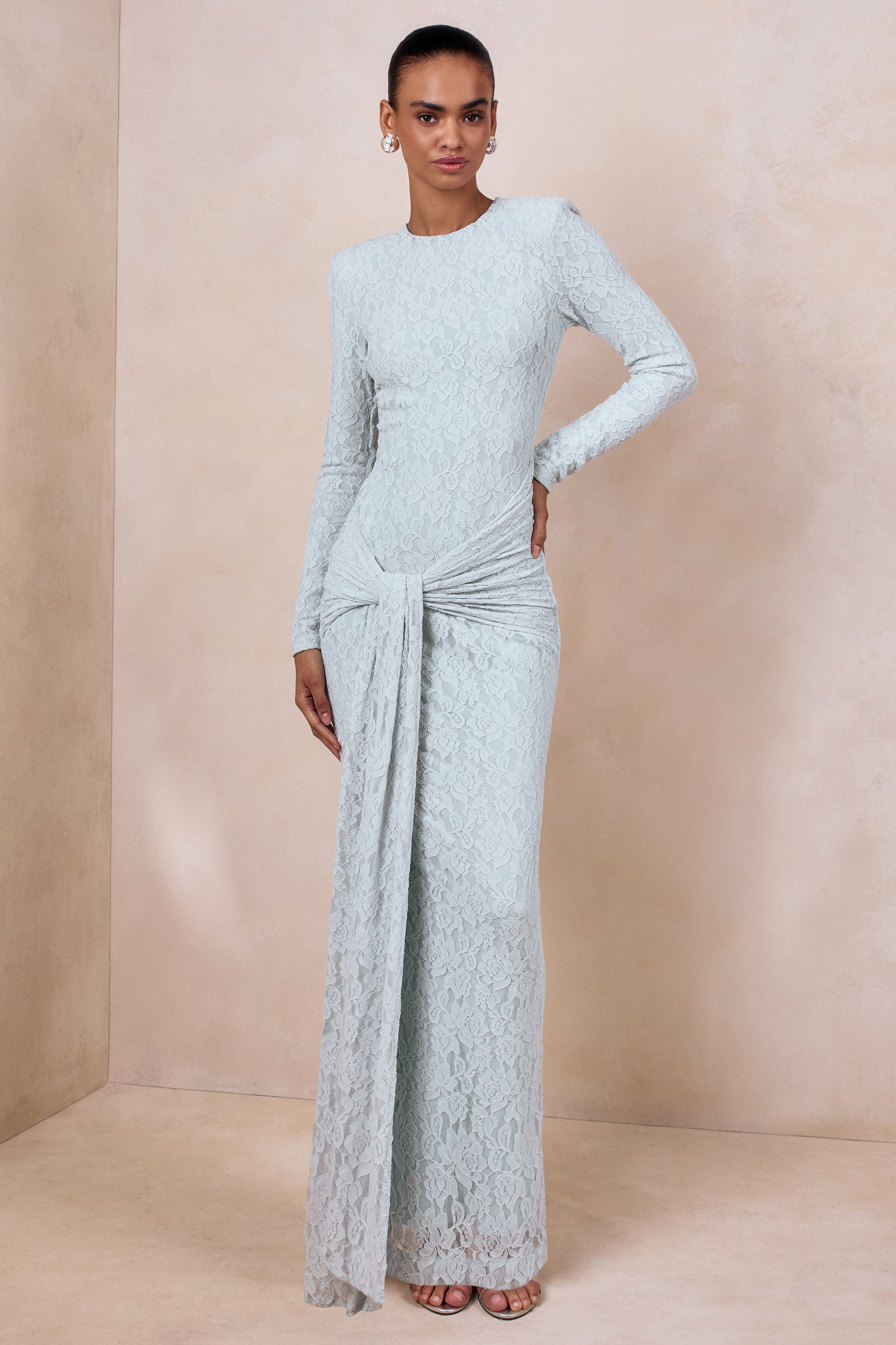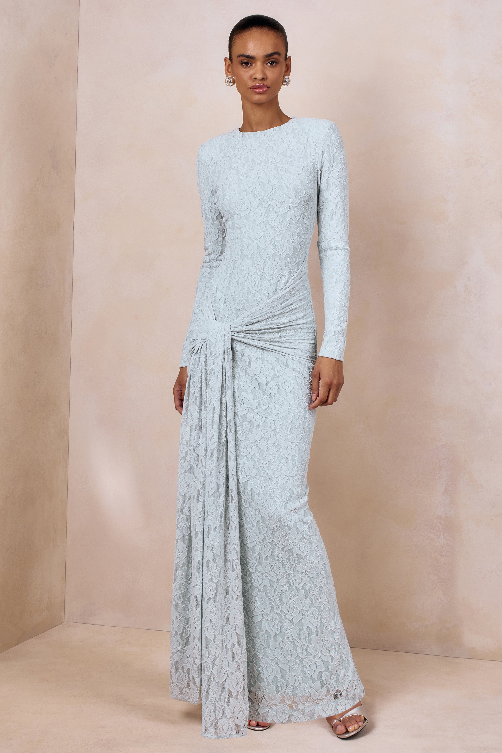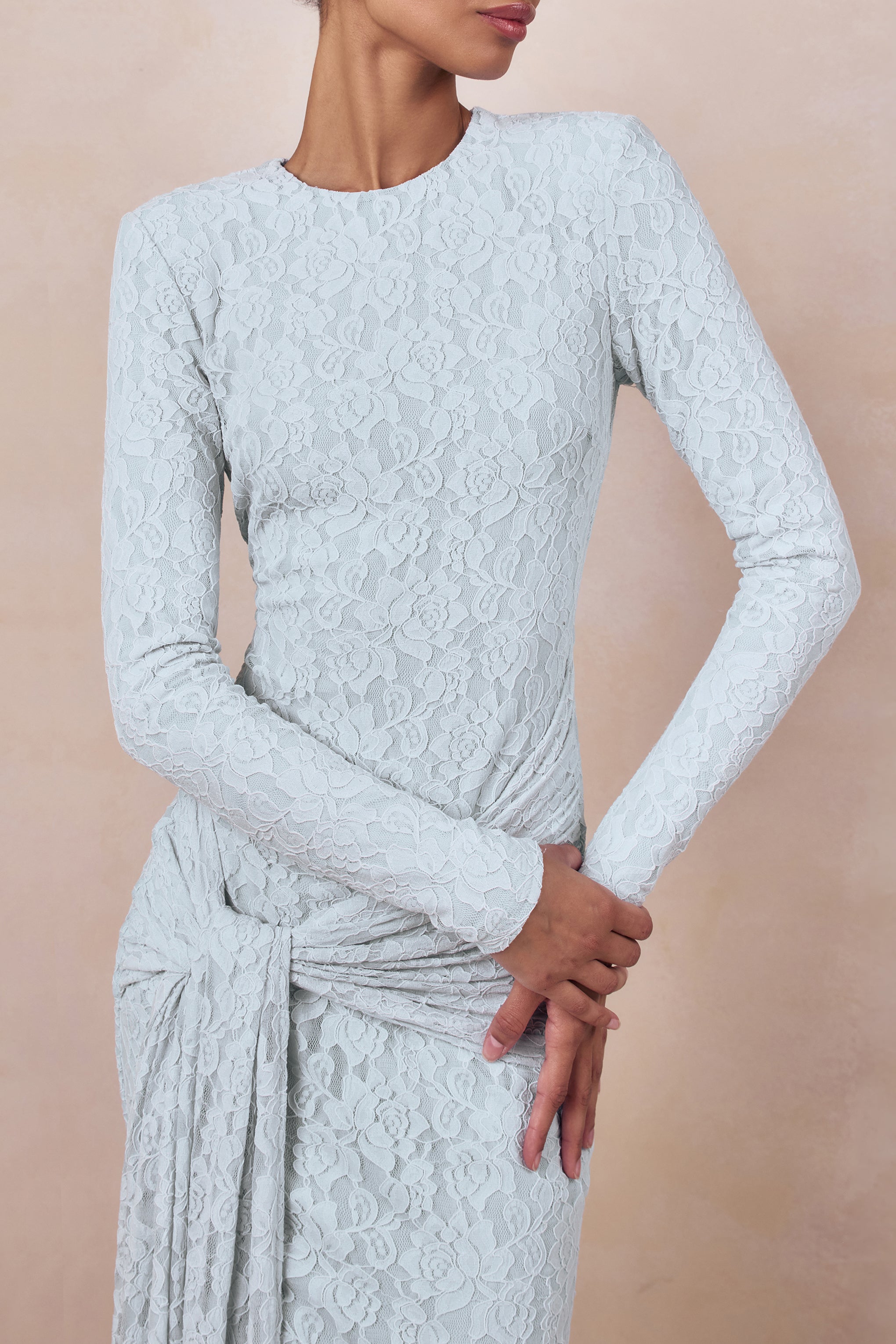 Evangela captures ethereal sophistication through a silhouette that feels both graceful and striking. Crafted from our premium powder blue lace. this maxi contours the body with a soft. delicate texture that enhances every curve. The crew neckline adds a refined touch. while gathered detailing and the cascading sash create sculptural elegance through the waist. A centre-back split brings ease of movement and a hint of allure with timeless poise. Evangela is designed for moments that call for effortless romance.