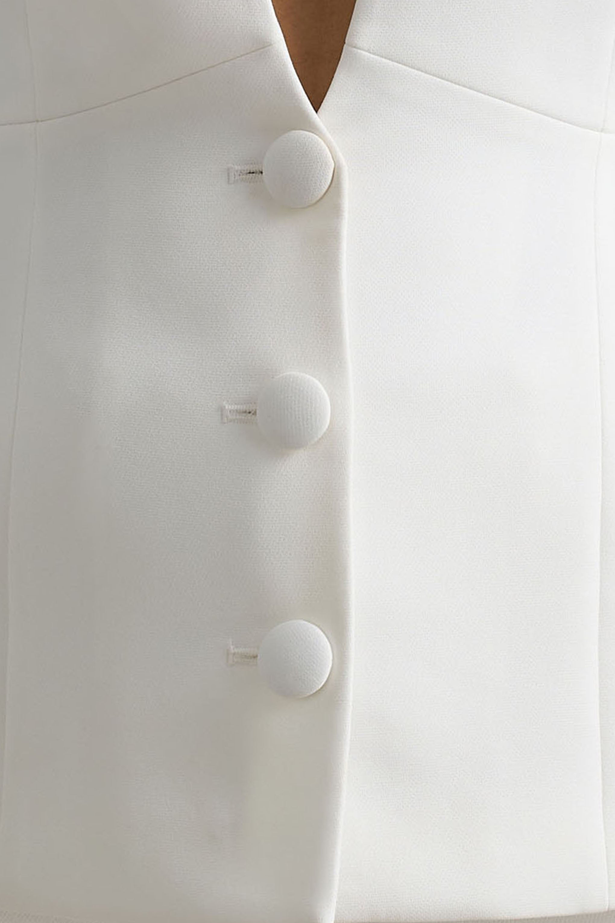 Introducing Rosalina. a power-piece that embodies sharp tailoring and feminine allure. Cut from our premium stretch crepe in a timeless white hue. this statement blazer effortlessly balances structure with sophistication. Designed with a daring plunge neckline and elevated by strong shoulder pads. it commands attention with every wear. Finished with a sleek button closure for a polished touch. Rosalina is the ultimate layering piece for evenings that call for power and poise.